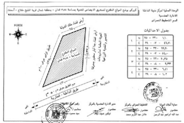 تخصص قطعة أرض أملاك دولة بمساحة ٣١.٨٤ فدان الكائنة بقرية الشيخ مفتاح بأسمنت - مركز الداخلة - محافظة الوادى الجديد ، بالمجان ، لصالح الصندوق الاجتماعي للتنمية الإقامة مزرعة إنتاج حيواني عليها بالاشتراك مع مؤسسة مصر الخير
