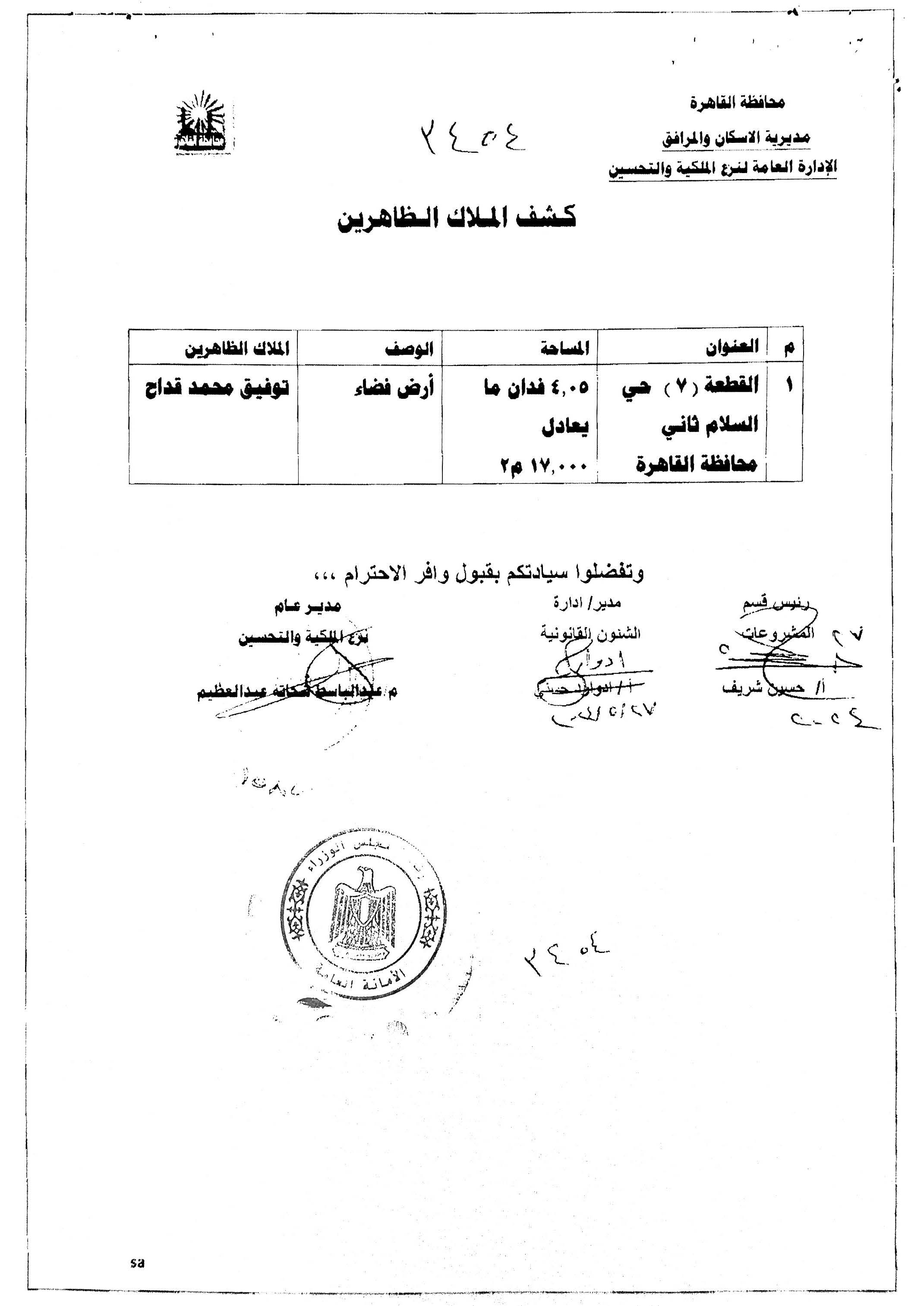 وعلى قرار رئيس مجلس الوزراء رقم 1366 لسنة 2023 باعتبار مشروع نزع ملكية قطعة الأرض رقم (7) الكائنة بحى السلام ثانى - محافظة القاهرة - بمساحة 11000م2 تقريبًا واللازمة لتنفيذ جزء من مشروع عدد 200 ألف وحدة سكنية بنطاق القاهرة الكبرى (مشروع أهالينا 6) من أعمال المنفعة العامة ؛